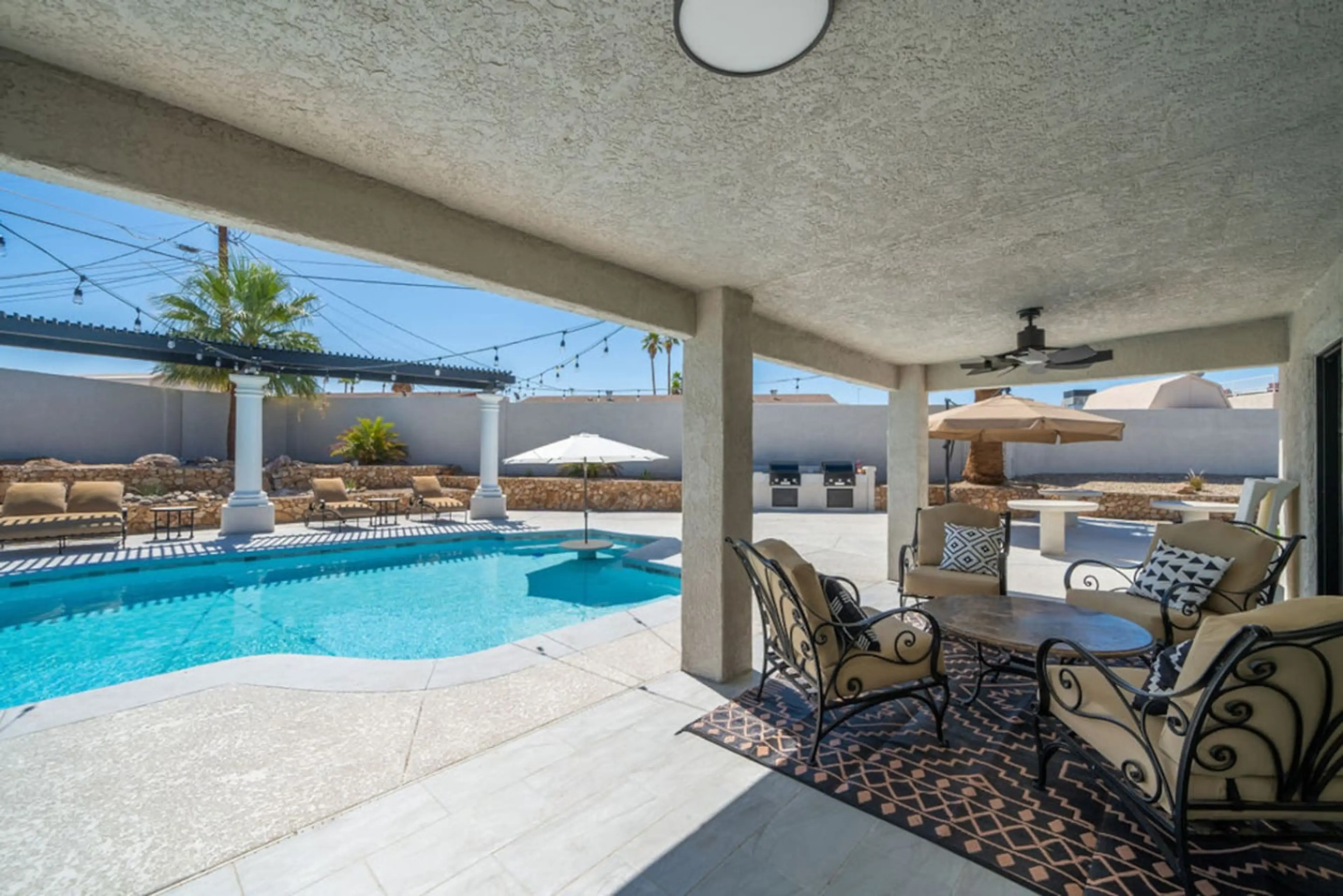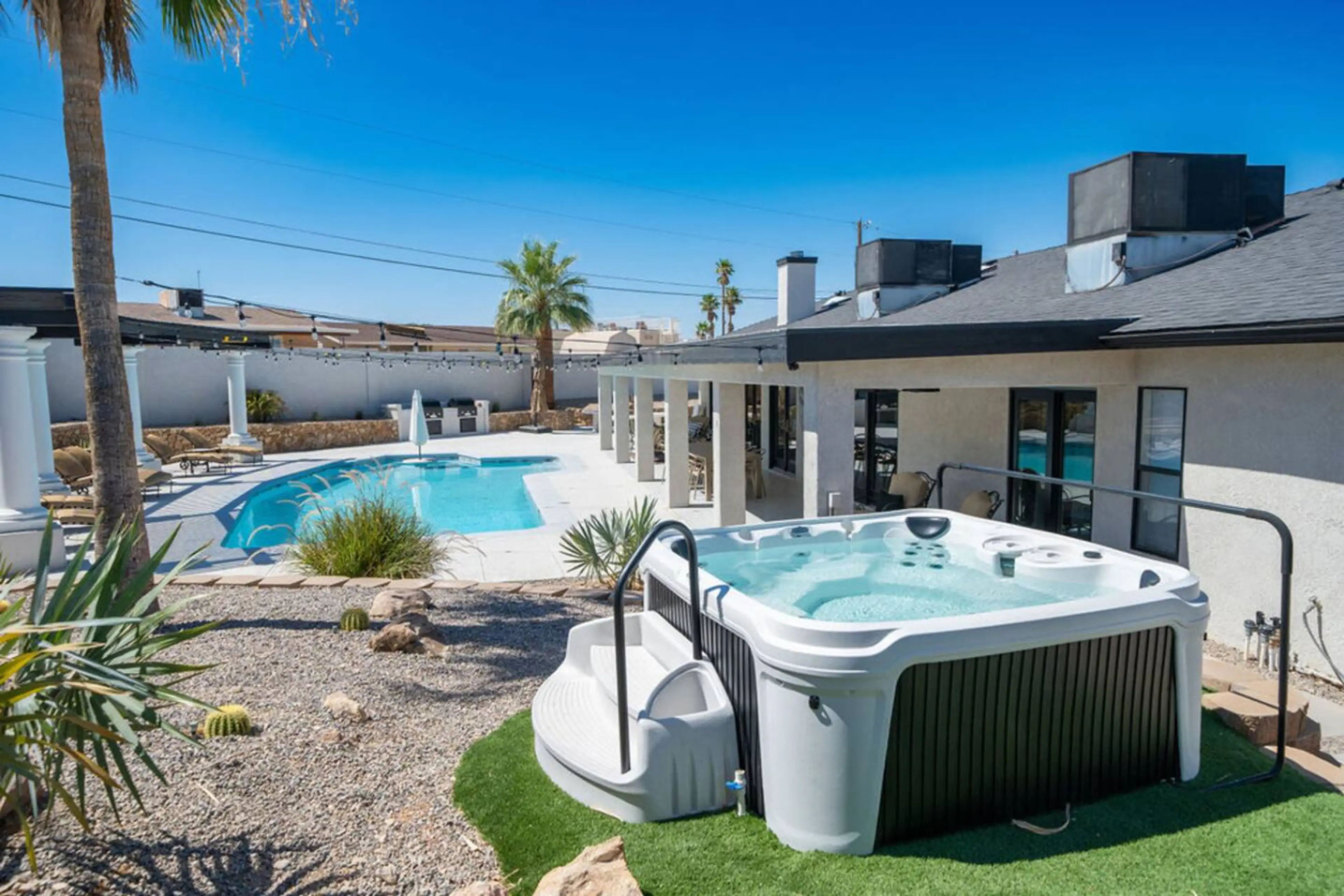 This 5BR / 3BA, 3,200 sq ft luxury home is one of Lake Havasu’s premier rentals, perfectly located near the lake, marinas, and boat launch ramps, with downtown just a short walk away. Set on over half an acre, enjoy a private pool, hot tub, fire pit, pickleball court, and dual BBQs. Inside features ...